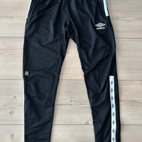 Umbro Vision Tailored treningsbukse/ vindbukse str 13/14. Buksen er svart og laget i lett, pustende materiale med meshfôr på innsiden. Elastisk linning med snøring gir justerbar passform. Modellen egner seg til fotballtrening og annen fysisk aktivitet, samt som generell trenings- og fritidsbukse.