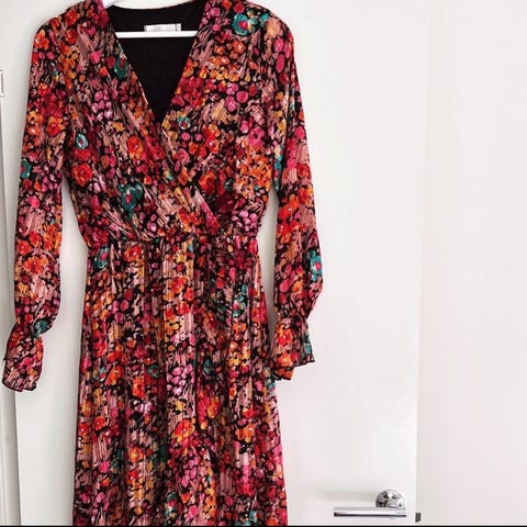 Reserved sommerkjole for dame i størrelse 36. Kjolen er laget i viskose og har et flerfarget blomsterprint i hovedsak i rosa, lilla, røde, grønne og gule toner. Modellen har lange ermer og markert midje med lett rynking, samt skjørt med fall. Passer som lett kjole til vår- og sommerbruk eller innendørs hele året.