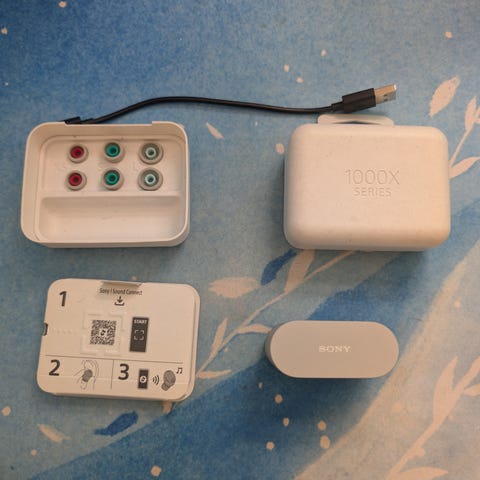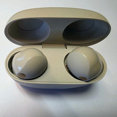 Sony WF-1000XM5 trådløse ørepropper med ladeetu selges. Øreproppene leveres med et kompakt etui for oppbevaring og lading.