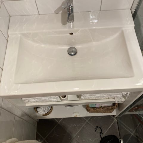 Baderomsservant med underskap i hvit utførelse. Servanten har integrert kum og overløp, samt ett hull for ettgreps servantarmatur. Underskapet har to dører med håndtak og oppbevaringsplass til baderomsartikler. Egnet for montering på bad eller toalettrom der det er behov for kombinert servant og oppbevaringsløsning.