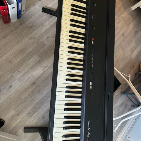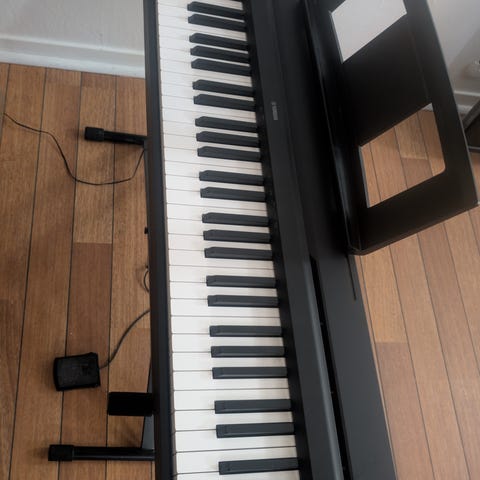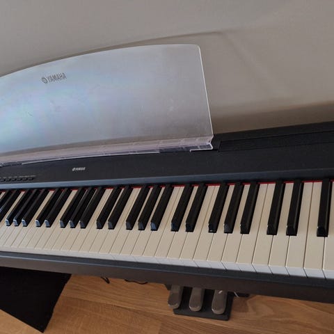 Pent og lite brukt Yamaha P-120 piano med fullt klaviatur, veide tangenter Sustainpedal følger med. Pianoet har flere funksjonsknapper, display og tilkoblinger på baksiden, blant annet hodetelefonutgang, MIDI/TO HOST, AUX-inn/ut og andre lydtilkoblinger. Pianobenken som vises på bildet følger med oppsettet og det samme gjør stativet til pianoet.