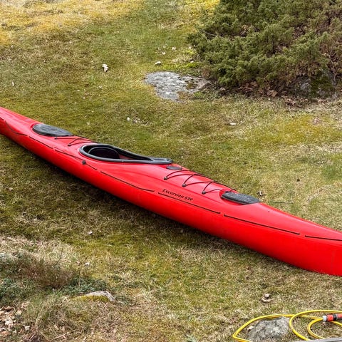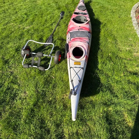 Pent brukt havkajakk. Veier kun 17-18 kilo. Du får den greit på biltaket alene. Ingen skader . Ror pedalen må ordnes. (Svært retningsstabil også uten bruk av ror. )