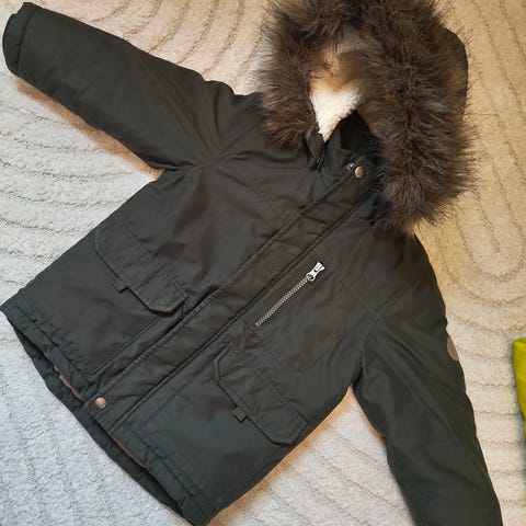 Name it vinterjakke for barn i størrelse 104. Jakken er blå og Den har hette, glidelåslukking foran og helprintet mønster med figurer og potespor. Ermene har elastiske avslutninger for bedre passform. Unisex-modell som passer til hverdagsbruk i kjøligere vær.