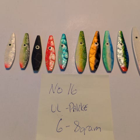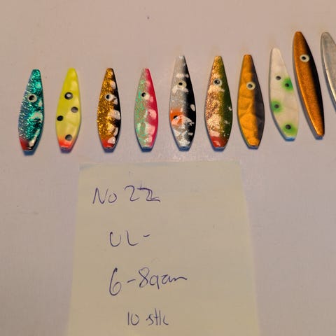 Danske OGP gjennomløpere /sjøørretsluker. Snurrebassen, Silling, osv. Meget bra sjøørret /ørretsluker. Kaster godt, beveger seg flaksende selv ved lav hastighet. Roterer meget godt ved spinnstop. Beste gjennomløpere jeg har prøvd. 10 - 17 gram på disse. Flesteparten er nye. Sendes etter kjøpers ønske, eller hentes i Hønefoss.