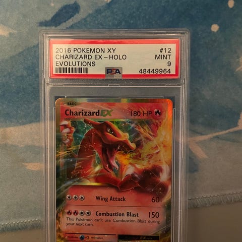 Pokémon Charizard EX Flashfire samlekort gradert av PSA med karakter 10 (Gem Mint). Kortet viser Charizard EX fra Flashfire-serien, med angrepene Stoke og Fire Blast. Kortet er innkapslet i en hard PSA-holder med etikett som angir sett, kortnavn og serienummer. Egner seg som samlekort for Pokémon TCG-samlere og som del av en gradert kortsamling.