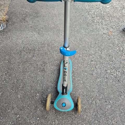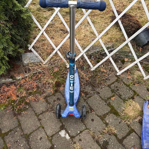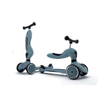 Scoot and Ride løpesykkel og sparkesykkel i blå farge. Modellen har tre hjul for økt stabilitet og kan brukes både som løpesykkel med sete og som sparkesykkel ved å justere setet og styret. Egnet for små barn som skal øve balanse og motorikk. Plast- og metallkonstruksjon med håndtak og fotbrett tilpasset barn.
