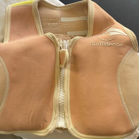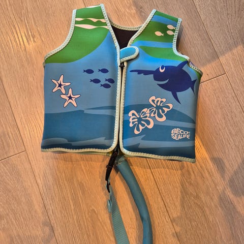 Brukt bare et fåtalls ganger, da vestens eier plutselig kunne å svømme. Passer fra ca 3 til 6 år, eller 19 til 30 kg. Kult mønster til tøffe barn.