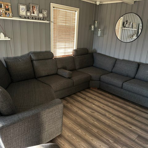 Sofaen har feste i hjørnet, deles lett i to for enklere å transportere.