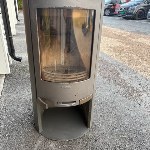 Frittstående vedovn i grått stål. Ovnen har stor frontdør med glass og sideglass som gir innsyn til flammene fra flere vinkler. Luftventiler er plassert øverst på ovnen. Passer for montering mot vegg med tilkobling til pipe i bakkant. Egnet som varmekilde i stue eller andre oppholdsrom der det er tilrettelagt for vedfyring og godkjent pipe-/røropplegg. Bildene er tatt før rengjøring av ovnen, glasset under peisovnen er inkludert i prisen.