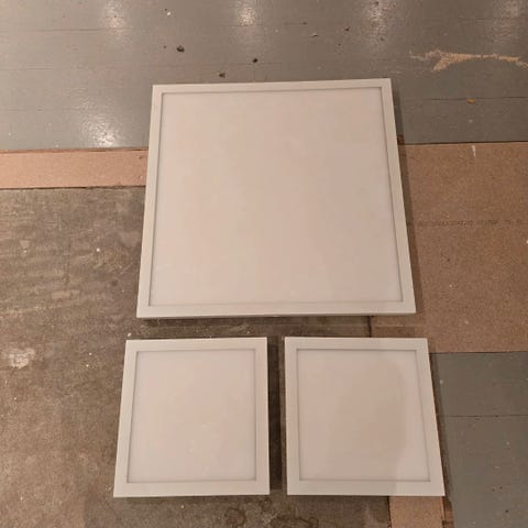 Fagerhult led lamper i forskjellige størrelser, store er 50 cm i omkrets 39w, og og de dom noe mindre er på 40 cm i omkrets er 25watt.