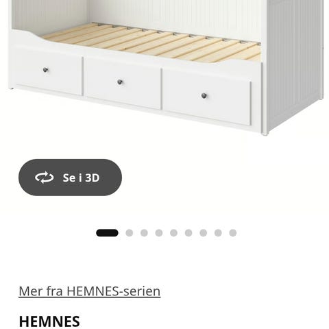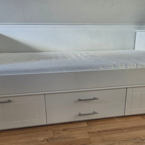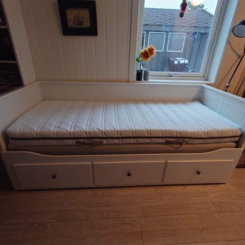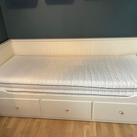 IKEA Hemnes dagseng i hvit utførelse. Sengen har rygg- og sidepaneler med profilert treverk, og tre skuffer til oppbevaring under liggeflaten. Egnet som enkeltseng eller dagseng i soverom, barnerom eller gjesterom. Skuffene kan trekkes ut for dobbelseng. Madrass følger med om ønskelig, denne er ca 1 år gammel. Noe bruksmerker. Må hentes.