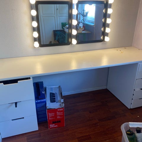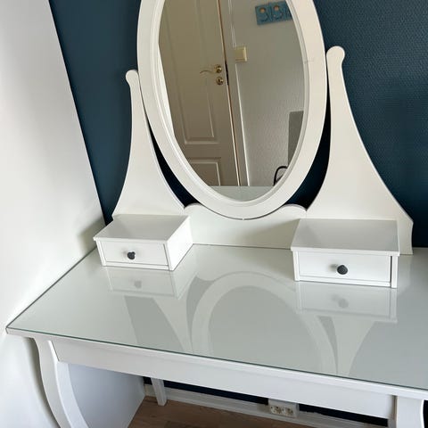 IKEA hemnes sminkebord: pent brukt, må vaskes litt inne i skuffene. Link til mål: https://www.ikea.com/no/no/p/hemnes-sminkebord-med-speil-hvit-30374413/