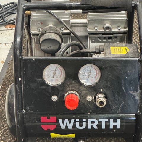 Würth Super ECU kompressor for trykkluft. Enheten drives på 230V og har integrert bærehåndtak for enkel transport.
