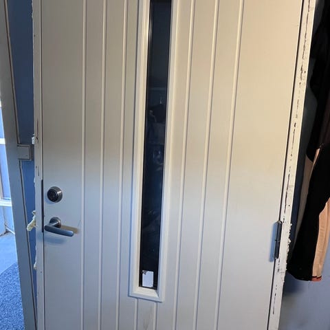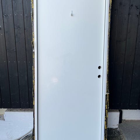 Ytterdør med dørkarm i hvit utførelse med profilert design og integrert buet glassfelt. Døren har tre felter på innsiden utenom glassfeltet og er egnet som inngangsdør til bolig, bod eller garasje.