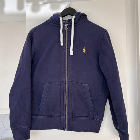 Ralph Lauren Polo hettegenser for herre i størrelse S. Hettegenseren er brun og laget i bomull. Modellen har glidelås i front, kengurulommer og snøring i hetten. Passer til hverdagsbruk og som et lag over t‑skjorte eller skjorte.
