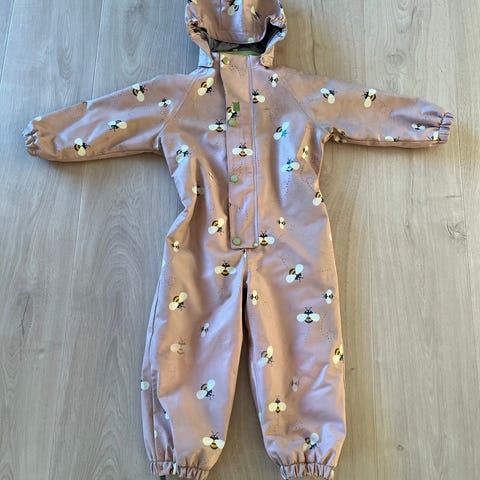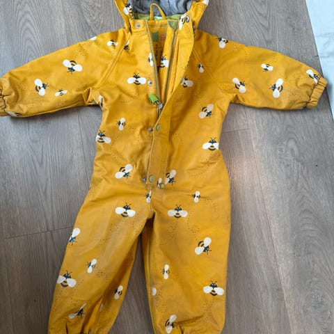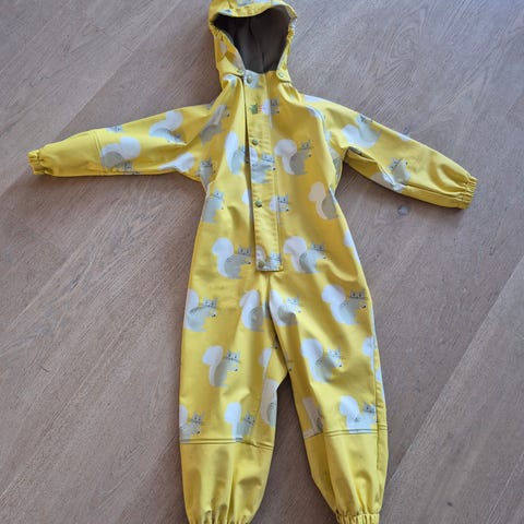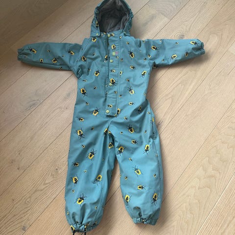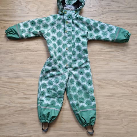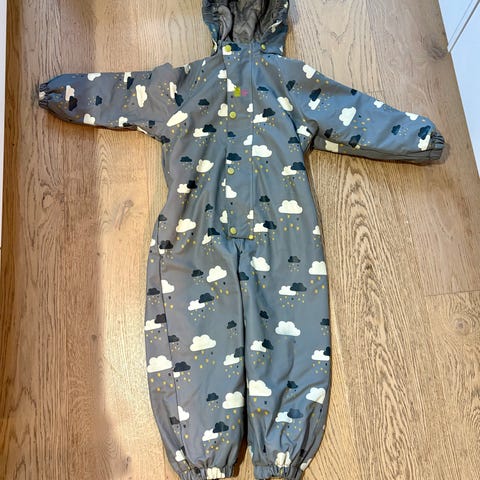 Veldig fin og praktisk fôret regndress i str 104. Stor i størrelsen. Passer perfekt til bruk på vår og høst. Brukt av to barn. Mangler strikker ved beina og tre av fire knapper til feste av strikk. Se bilder. Ingen hull.