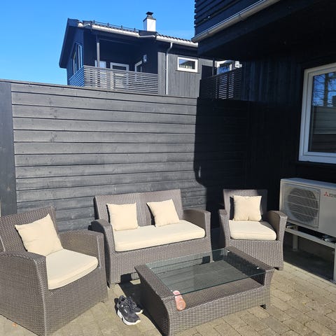 Hjørneformet hagesofa med bord i grå kunstrotting. Sofaen har rette armlener og løse sitte- og ryggputer i grått tekstil. Bordet har rektangulær bordplate og understell i samme rottingmateriale som sofaen. Passer til bruk på terrasse, balkong eller i hage som sittegruppe utendørs. Den ene glidelåsen til sitteputa har blitt ødelagt. Kjøpt for 3 år siden til 15 000 kr som ny. Selger rimlig med ingen skader på rottingen. Ta kontakt om det er noe du lurer på