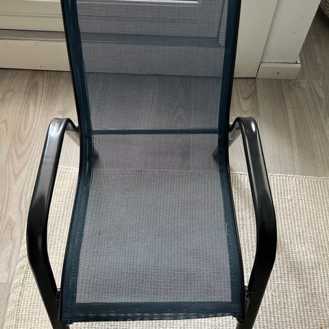 Hagestol i svart tekstil med høy rygg. Stolen har buede armlener og understell i metall. Sete og rygg er i nettingstoff som slipper gjennom vann. Egnet til bruk på terrasse, balkong eller i hage. Stolen kan stables for enklere oppbevaring.