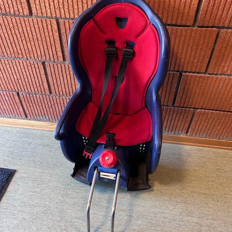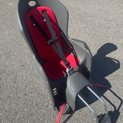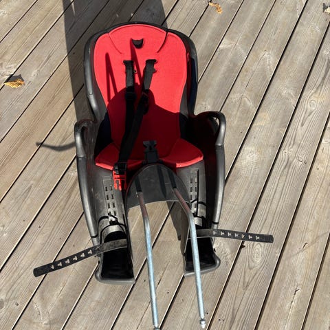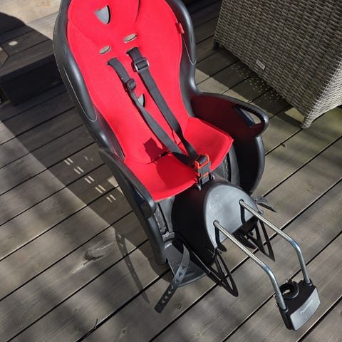 Hamax barnesykkelsete opptil 22kg i rød og svart. Setet monteres bak på sykkelen med medfølgende bøylefeste (ikke avbildet men følger med). Utstyrt med justerbare seler og fotstøtter med reimer for å holde barnets føtter på plass.