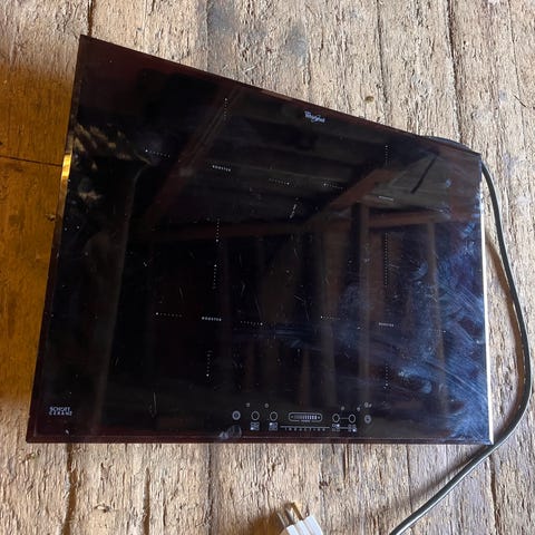 Gram induksjonstopp med fire kokesoner. Platetoppen har glatt glassoverflate og berøringsbetjening i front. Den er beregnet for innbygging i benkeplate over komfyr eller stekeovn, og tilkobles med vanlig støpsel som vist på bildet.