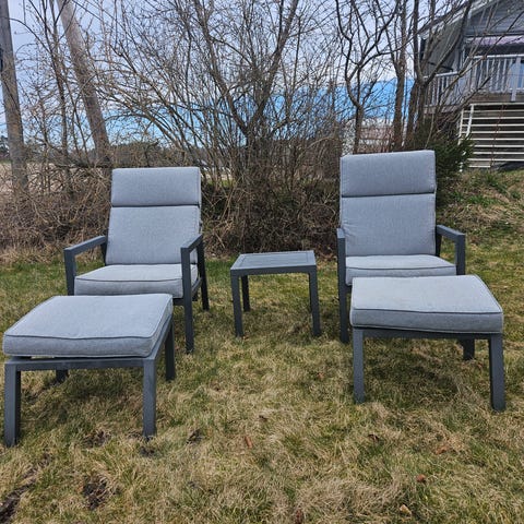 Lenestol med ramme i lys, lakkert metall og sidepaneler i strammet snortrekk. Puter i lys, nøytral tekstilfarge. Mål ca. 87 x 87 cm, høyde ca. 61 cm. Stolen kan brukes både inne og ute under tak eller på terrasse, avhengig av materiale på puter og ramme. Egnet som enkeltstående lenestol eller som del av en sittegruppe.
