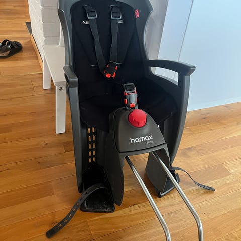 Hamax barnesykkelsete for montering bak på sykkel. Setet har justerbare skulderstropper og sikkerhetssele, samt fotstøtter med reimer. Beregnet for barn opptil ca. 22 kg. Leveres med festebøyle og brakett for montering på voksensykkel. Egnet til bruk på vanlige hverdagsturer og transport av barn på sykkel, innenfor vektgrensen angitt av produsent.