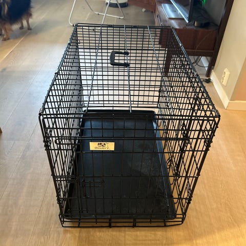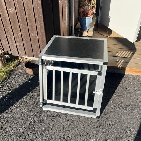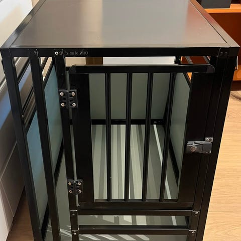 B-Safe Pro hundebur i metall med svart finish. Buret har solide sprosser og tette sideplater som gir god beskyttelse og avskjerming i bil eller hjemme. Hengslet dør i front. Egnet for sikring av hund under transport eller som fast liggeplass.