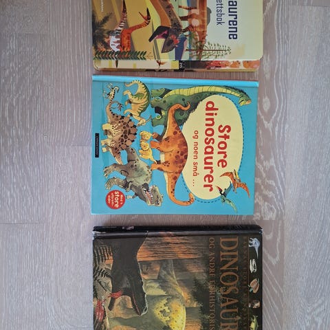 Pakke med tre bøker om dinosaurer for barn.