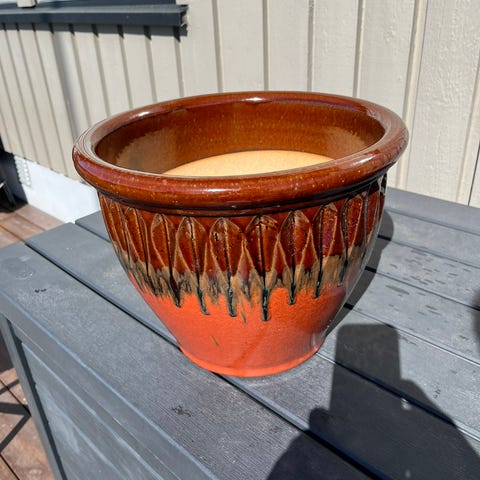 Flott potte med nydelig mønster. 50 cm i diameter på toppen, 35 cm høy. Passer fint på veranda og terasse, eller inne.