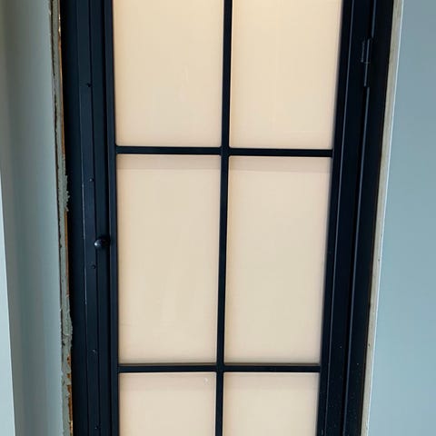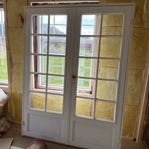 Dør med buet glassfelt i klassisk stil. Døren har sprosseinndelte glassruter med ramme og hvitmalt fyllingsfelt nederst på hvert dørblad. Leveres med håndtak og låskasse slik det vises på bildene. Egnet som innvendig dør mellom rom der man ønsker lysgjennomgang og visuell kontakt, for eksempel mellom stue og spisestue eller gang og oppholdsrom.