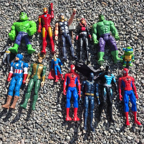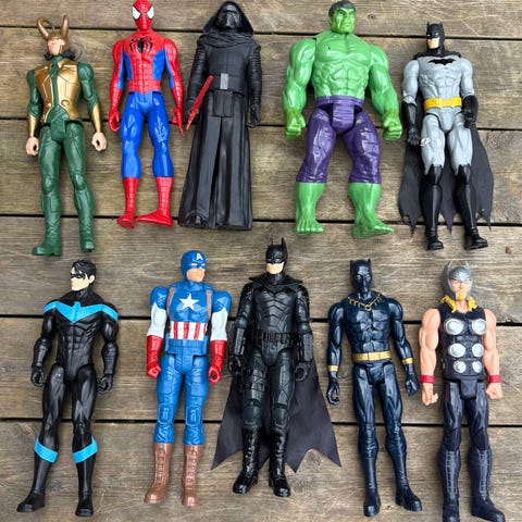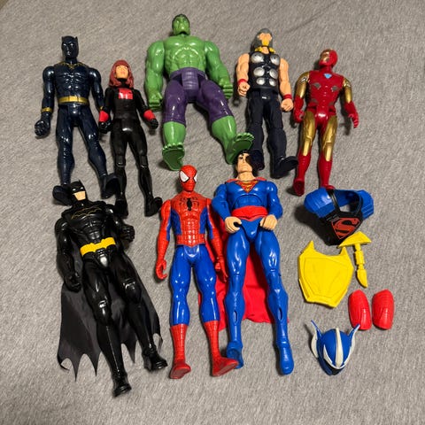13 diverse actionfigurer selges samlet. Her er figurer fra Marvel, DC comics, Fortnite og Ben 10 samlet i skjønn forening. Figurene er ca. 30cm lange, laget i hard plast og har div bevegelige ledd.