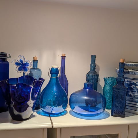 Samling med blå glassflasker og vaser i ulike former og størrelser. Settet består av flere dekorative flasker, noen med kork, samt små og mellomstore vaser og skåler i blått glass. Glassdelene har både klare og mer matte blåtoner, og formen varierer fra runde og kulerunde til høye, slanke og kantede varianter. Egner seg som dekor, til oppbevaring av mindre mengder væske eller som små vaser til blomster og grener.