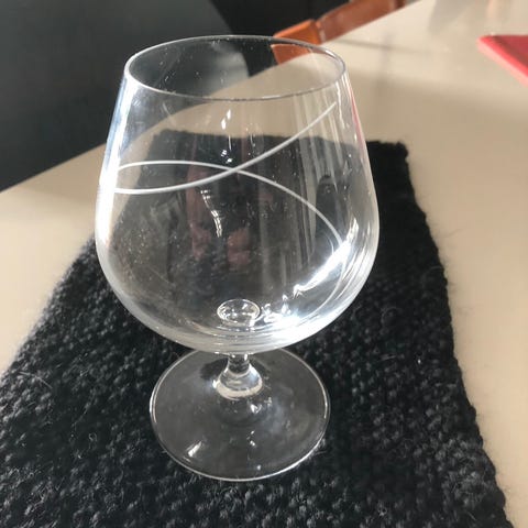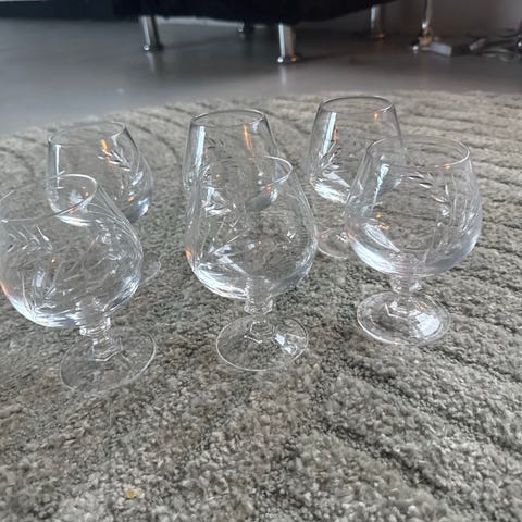 6 Krystall cognac glass fra Praha, Bohemia med dekorativ gullkant og mønster på klokken. Glassene har kort stett og rund klokke som egner seg til servering av cognac eller andre avec-drikker. Leveres som sett med 6 like glass, og passer til bruk ved borddekking og servering i hjemmet.