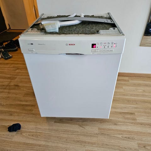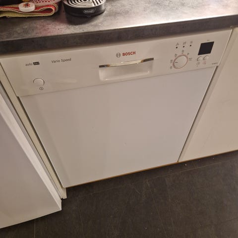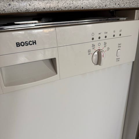 Bosch SuperSilence oppvaskmaskin. Front i hvit med displaypanel. Knappene er noe slitt, men den fungerer fint. Stillegående.