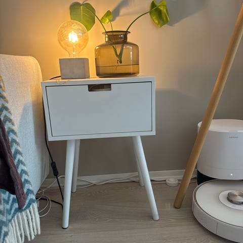Nattbordet er hvitt og har et rent, moderne uttrykk som passer godt på soverom, gjesterom eller som lite sidebord.