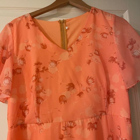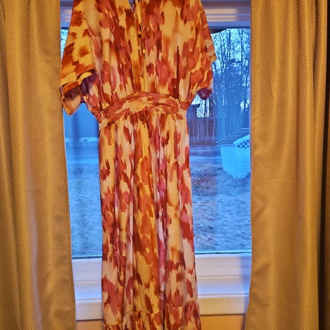 Zara sommerkjole i viskose for dame i størrelse L. Kjolen er flerfarget med et mønstret trykk i hovedsak rosa og røde toner. Modellen har v-hals og lange ermer med mansjett. Skjørtet er langt med vid fasong og delte sømmer som gir et lett og luftig uttrykk. Materialet er viskose, som gir et mykt og behagelig stoff som faller lett. Egnet som sommerkjole til hverdagsbruk eller enkle anledninger.