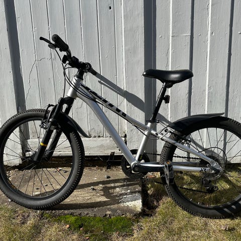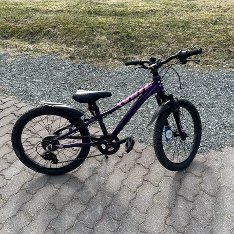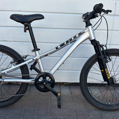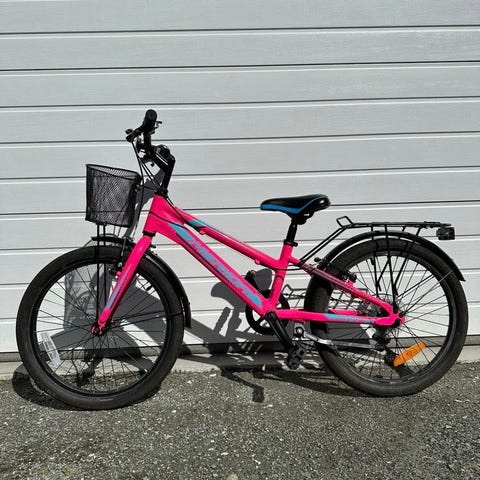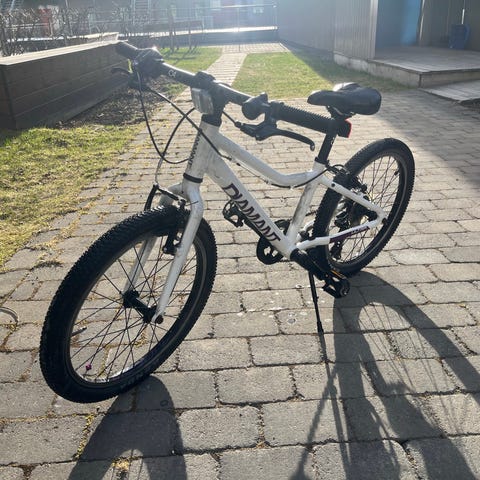 White barnesykkel med 20" hjul. Sykkelen har aluminiumsramme i sølvfarge, 6 gir og vrigrep for girskifting. Utstyrt med dempegaffel foran, felgbremser, sete med justerbar setepinne og fram- og bakskjerm. Kjøpt for 2 år siden