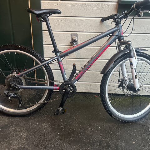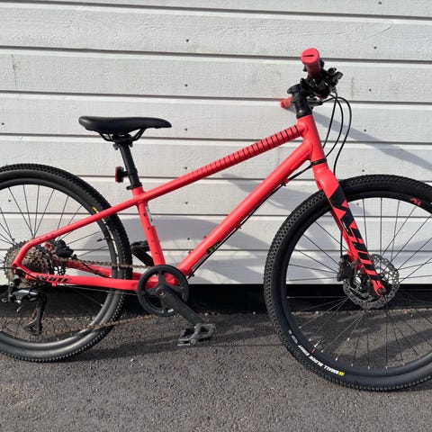 White XC 24.0 Lite barnesykkel med 24" hjul. Sykkelen har rød/rosa ramme, rett styre og skivebremser foran og bak. Utstyrt med støtte og forskjerm. Bakskjerm mangler, ringeklokke burde byttes. Sete har en liten skade (se bilde). Gir og bremser fungerer. Lite slitasje på dekk. Egnet som barnesykkel til hverdagssykling og turbruk.