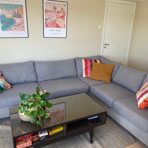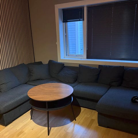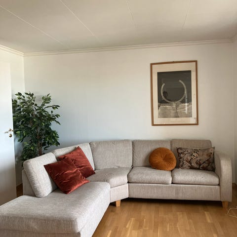 Målene for sofaen finner du på bildene. Noen småflekker som ikke gikk av etter rens, men på plasser som ikke er synlige/på undersiden. Er et hull på ene puten på baksiden (siste bilde), og foten på hjørnet er litt ustødig, har ikke merket noe til det selv, annet enn når man skal flytte sofaen. Ikke noe mulighet for å levere den, så sofaen må hentes☺️ Pris kan diskuteres✨