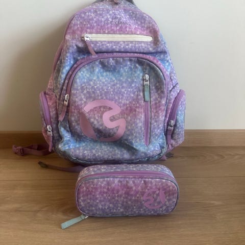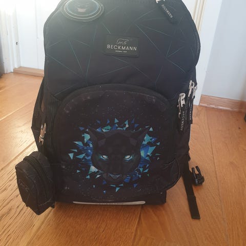Sort skolesekk fra Beckamnn med Fotball /tiger bilde. Brukt 1-4 klasse . Men er helt hel og pen og har masse bruk igjen.