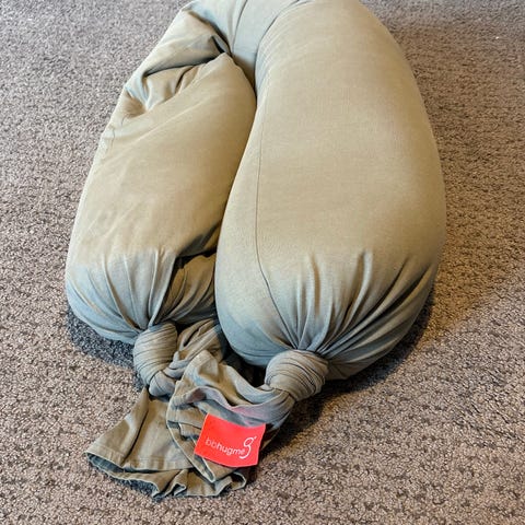 BBHUGME gravidpute i grønn farge. Puten er formbar og kan knytes i endene for å tilpasses ønsket støtte. Egnet som støttepute under graviditet og ved amming, samt som avlastning for rygg, mage og ben i liggende eller sittende stilling.
