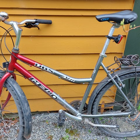 Forskriftsmessig utstyrt med refleks på pedalene, refleks foran og bak, to gode bremser og bjelle.