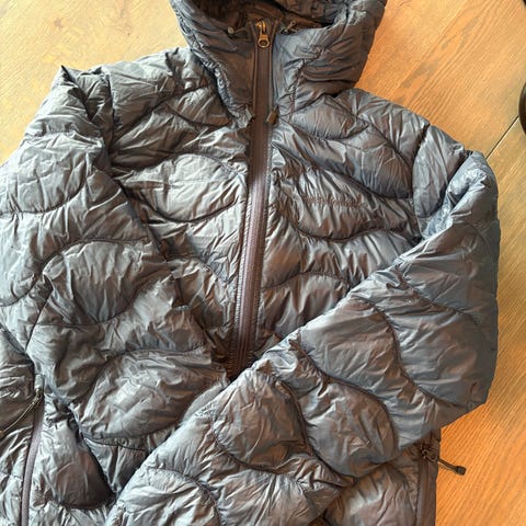 Peak Performance dunjakke for dame i størrelse L. Jakken er hvit og fylt med dun. Modellen er hoftelang med gjennomgående glidelås foran og hette. Horisontale og skrå sydde dunkanaler gir jevn fordeling av dunfyllet. Egnet som ytterjakke i kjøligere vær.