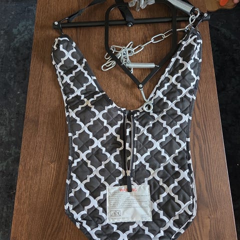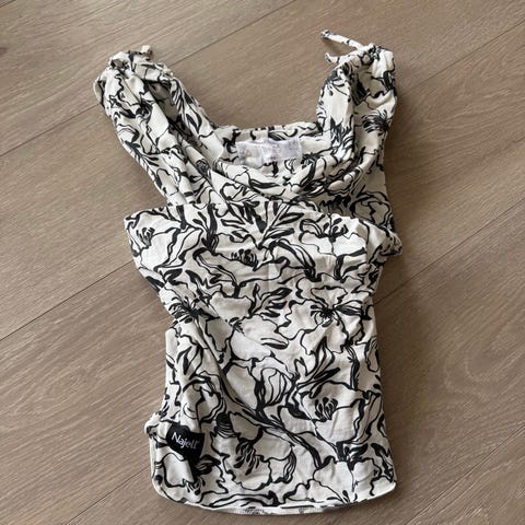 Najell Wrap bæresjal i størrelse M. Bæresjalet er hvit og svart mønster. Kjøpt i 2025 og lite brukt, men ute av kolleksjonen så finner ikke eksempel bilde fra nettet.