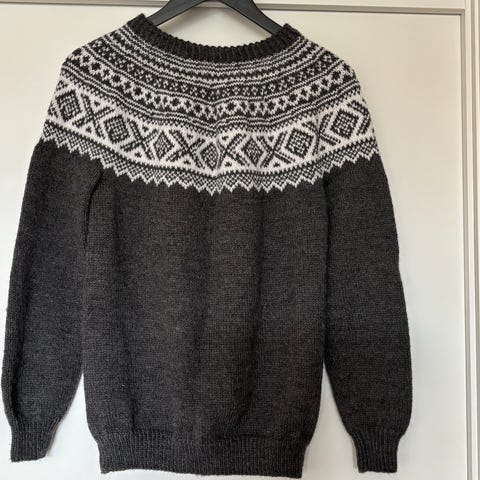 Ola, eller «Stompa» genseren som den også ble kalt. Strikket etter ett gammelt mønster, med rundfelling og forhøyning i nakken som gjør at den sitter finere på.