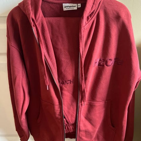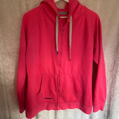Fruit of the Loom Lady Fit hettejakke i størrelse XL. Jakken er rosa og laget i bomull. Den har glidelås i front, hette med snøring og to lommer foran. På brystet og ryggen er det trykk med teksten «Camp Lothepus» i hvitt. Passer som en casual hettejakke til hverdagsbruk. Står xxl inni den men er litt liten i str. ville si den hadde passet en L. Tilsalgs kr 140,-.