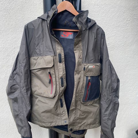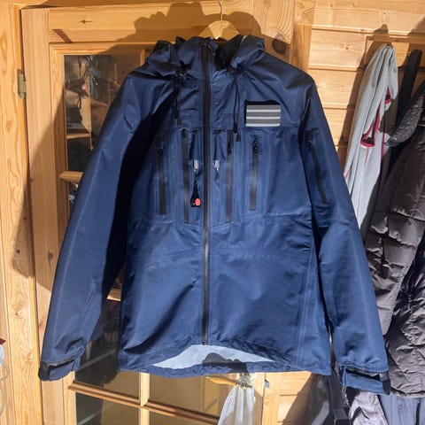 Brukt på noen få turer. Store lommer foran, innerlomme, stor lomme på ryggen og hette som kan rulles inn. Mansjetter på armene slik at alt vann ikke kommer inn😃