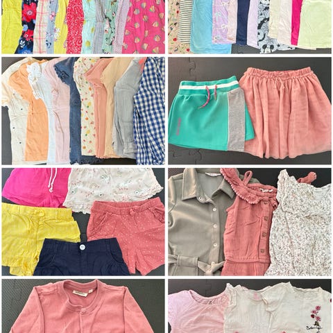 Klespakke for jente i størrelse 110/ 116. Pakken inneholder ulike sommerplagg, blant annet flere kjoler med blomster- og dyremotiv, en t-skjorte med trykk, shorts og en lett jakke/genser med glidelås. Plaggene har lyse og pastellfargede toner med mønster i flere farger. Egnet til hverdagsbruk og sommerbruk for barn i størrelse 116. Noen flekker og bruksmerker. Fra HM, Kappahl, Lindex og Cubus.