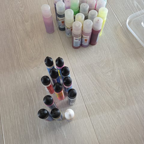 Blandet pakke med diverse hobby- og håndverksprodukter. Inneholder blant annet 5 Min. Epoxi sett med herder og harpiks (50 g flasker), flere små glass med akrylmaling/decorlakk, samt en rull naturfarget hampesnor.