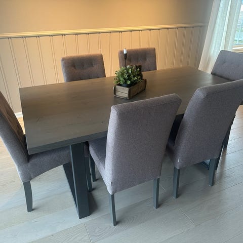 Seks spisestoler er av merket Jakobs Home og har en nypris på ca 3000 - 3500 kr per stykk på tilbud.